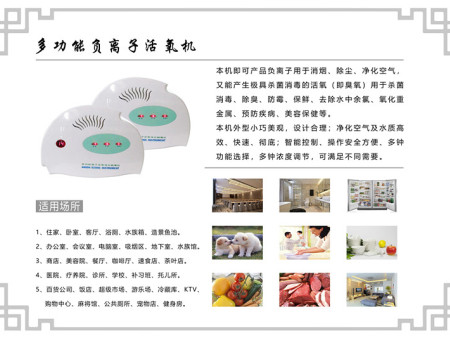 既可產(chǎn)生負離子用于消煙、除塵、凈化空氣;又能產(chǎn)生極強的殺菌消毒的活氧(即臭氧)活性氧是一種廣譜殺菌劑,可殺滅細菌繁殖體、細菌芽孢、病毒、真菌,對原蟲及其卵囊也有很好的殺滅作用,還可破壞細菌毒素、乙肝表面抗原等。活性氧是一種強氧化劑,具有廣泛殺滅微生物作用,包括細菌、芽胞、病毒、真菌等,其殺滅速度較氯快600—3000倍。21世紀以來,由于科學技術(shù)發(fā)展,活性氧在消毒方面應(yīng)用有新的發(fā)展,如水、空氣、物體表面、食品、蔬菜的消毒等,在工業(yè)和農(nóng)業(yè)中滅菌也有應(yīng)用。